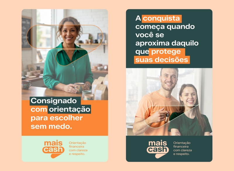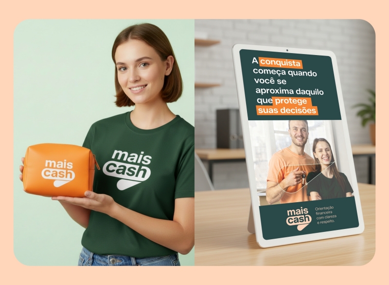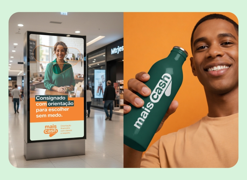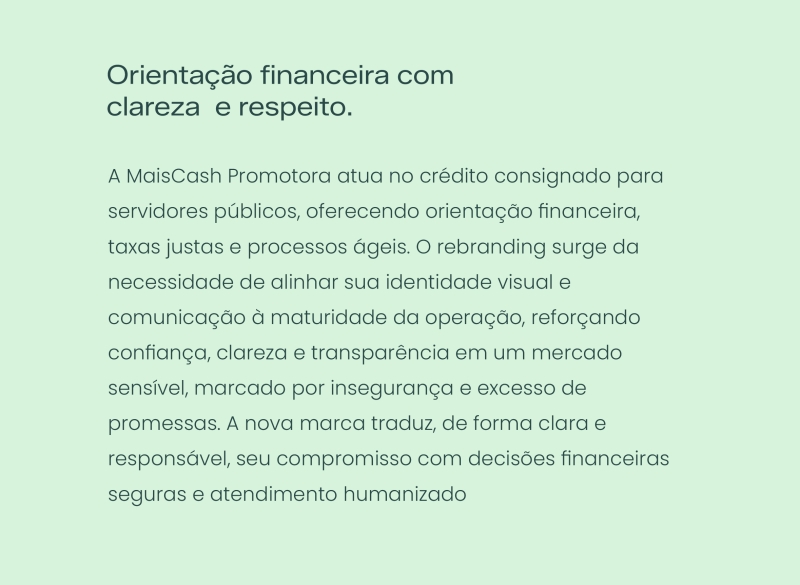 Foi executado um rebranding estratégico da MaisCash, focado em reposicionamento e não apenas estética. A nova identidade reduz ruídos, elimina excessos e comunica estabilidade, clareza e confiança. O projeto fortalece o papel consultivo da marca e a diferencia em um mercado marcado por desconfiança.